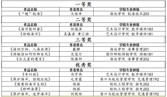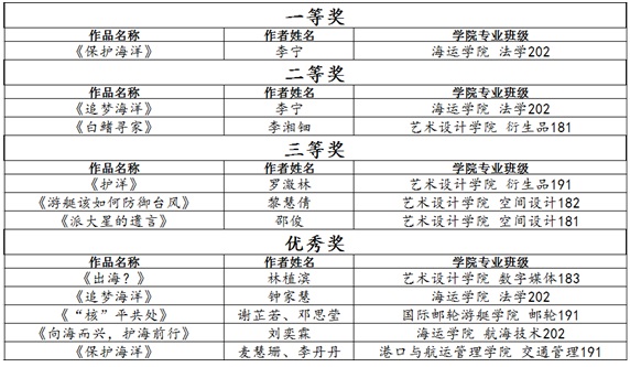 426日大赛启动以来,创新创业学院与海运学院积极组织,大赛共征集到来自全校同学78份作品,参赛作品类型共三类,A类是平面设计类,B类是数字媒体类,C类是海洋文化设计手绘作品类。610日,海运学院邀请祝鸿高级船长、李德鑫高级船长、陈昌明高级船长、黄橙老师、秦志勇老师等五位专业教师对参赛作品进行评选,通过层层筛选和评委老师的评审,最终评选出32份获奖作品及3个优秀组织奖。本次大赛的获奖作品将进行公开展示,A类与C类作品展示于航海楼一楼展示厅,所有获奖作品(含B类)后续将在海运团学公众号进行展示。
