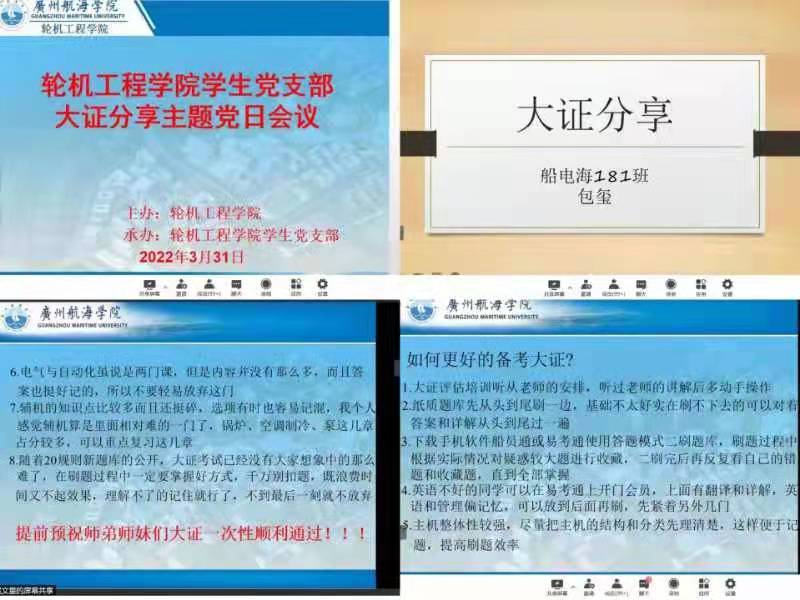 (轮机工程学院供稿)为引导学生关注两会热点,抢抓发展机遇,结合学院实际,轮机工程学院学生党支部于2022年3月31日线上召开考大证分享主题党日活动。本次邀请了学院2018级一次性通过大证理论、评估考试的9位学生代表分享备考的经历与感受,活动由学生第二党支部书记赵垒老师主持,此次活动面向全院学生。