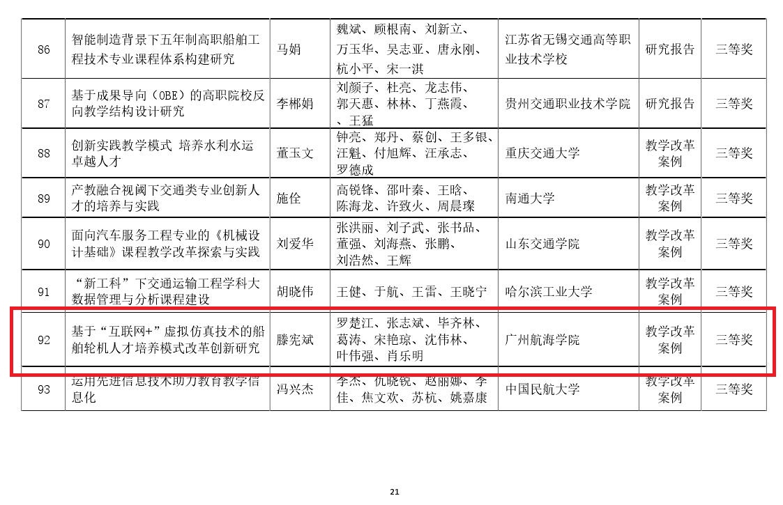 (轮机工程学院供稿)轮机工程学院滕宪斌院长主持的教学改革项目《基于“互联网+”虚拟仿真技术的船舶轮机人才培养模式改革创新研究》获得中国交通教育研究会2019-2021年度交通教育科学研究优秀成果奖三等奖。