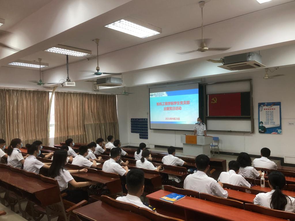 (轮机工程学院供稿)为开展好“我为群众办实事”实践活动,把党史学习教育成效转化为工作动力和实际成效,2021年9月23日下午,轮机工程学院学生党支部于教学楼109开展了“学风建设,党员先行”主题党日活动。学院学生第一党支部书记郭世俊老师、第二党支部书记赵垒老师、陈茂嘉老师以及全体学生党员、党务工作者、入党积极分子代表参加了活动。