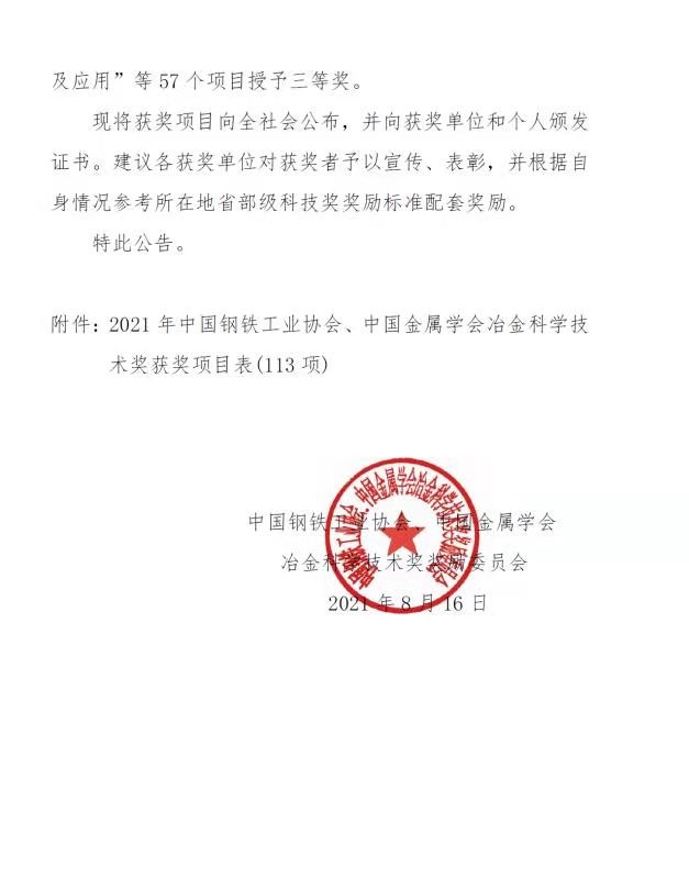 附注:冶金科学技术奖是行业最高奖项,一等奖以上项目可以作为第二年度参选申报国家科学技术奖的初评。是经国家科学技术部批准、由社会力量设立、面向全国评选的经常性科学技术奖;与中国汽车工业科学技术进步奖、何梁何利基金科学与技术奖、光华工程科技奖、中华医学科技奖等奖励并列为在统计时归入省部级奖励范畴的社会奖励。