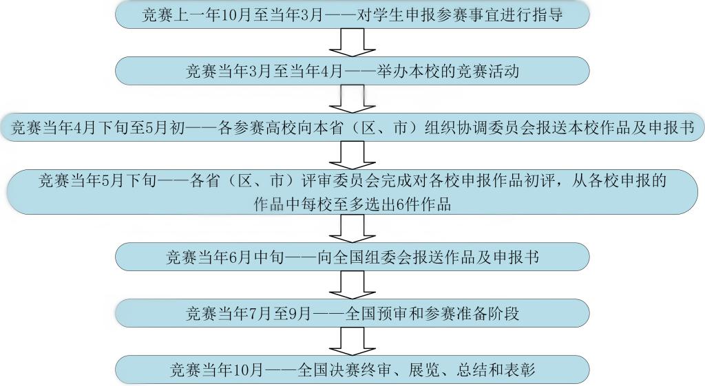 “挑战杯”竞赛由校级、省级、国家级三级赛事构成,每届“挑战杯” 竞赛从开始实施到结束,历时约一年。