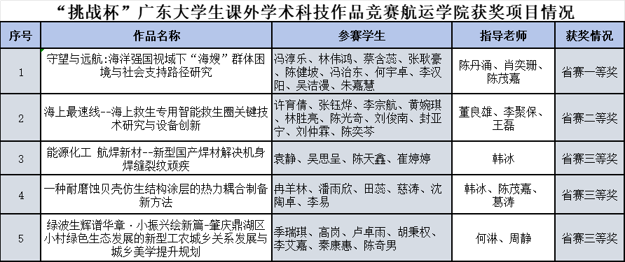 将以此次“挑战杯”竞赛为新起点,持续深化“三全育人”工作成效,以学科竞赛为引擎,聚焦智慧航运、绿色港航等前沿领域,为粤港澳大湾区航运事业发展贡献专业智慧与力量,为海洋强国、交通强国建设培养更多高素质人才。