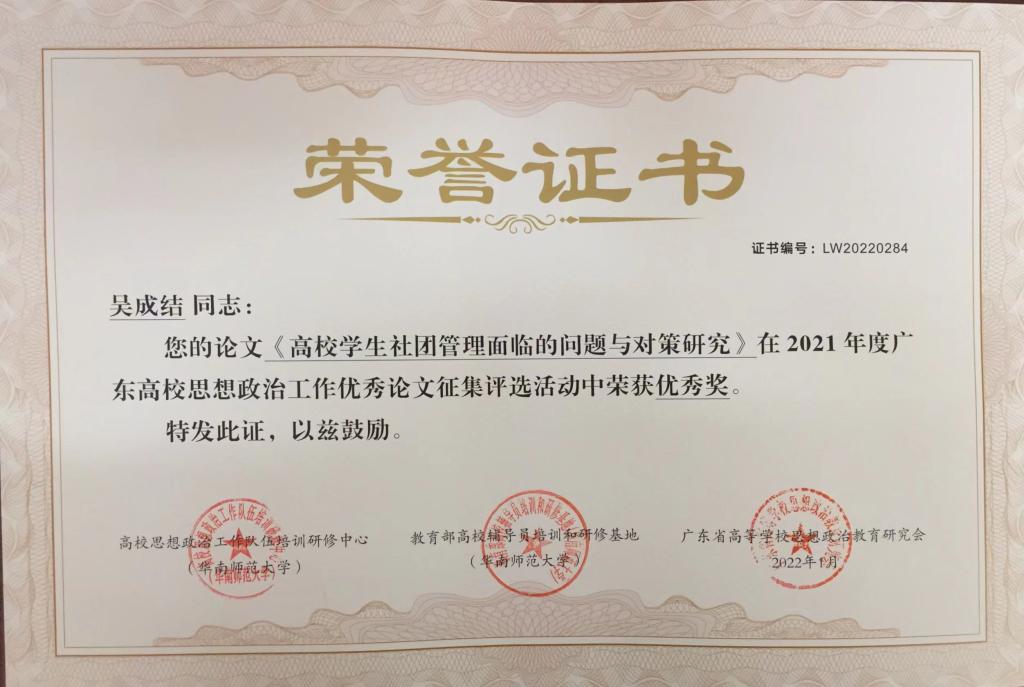 吴成结老师的《高校学生社团管理面临的问题与对策研究》论文在2021年度广东高校思想政治工作优秀征集评选活动中荣获优秀奖