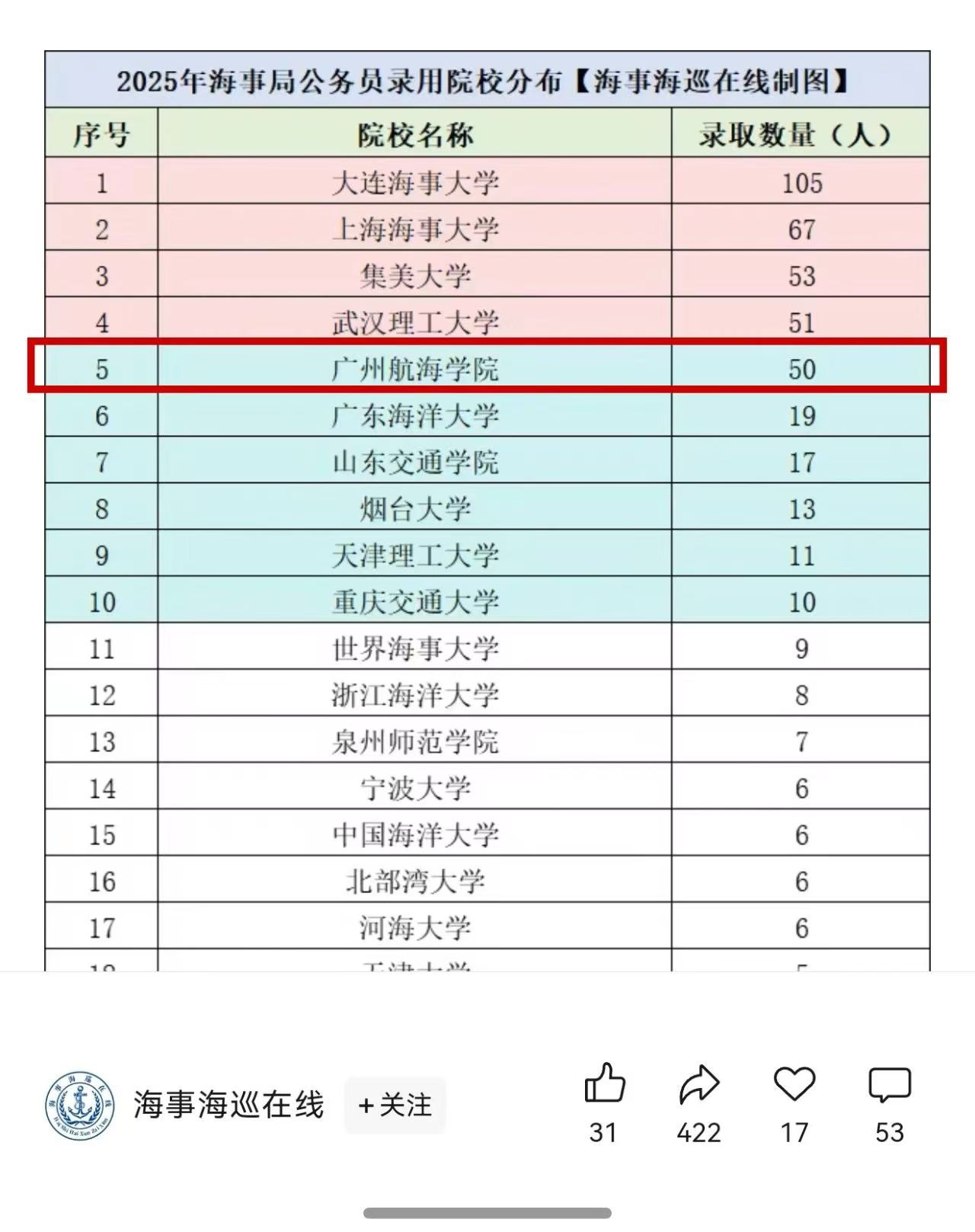 航海技术、轮机工程、海事管理、船舶电子电气工程、交通管理等专业的50名学生成功被录取,拟录用为广东海事局、浙江海事局、广西海事局等各地海事局公务员。学校总录取人数位居全国第五、广东第一;本科生录取人数50人位列全国第三、华南第一。在全国总招录人数较去年减少的情况下,录取人数相较去年30人显著提升,充分彰显了学校在面向海事系统培养高素质应用型人才方面的显著成效。